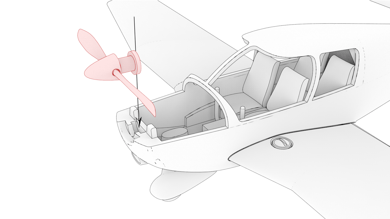 Placer l'hélice dans le logement prévu à l'avant de l'avion. Penser à bien ébavurer les pièces pour que l'hélice puisse tourner librement.