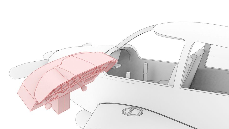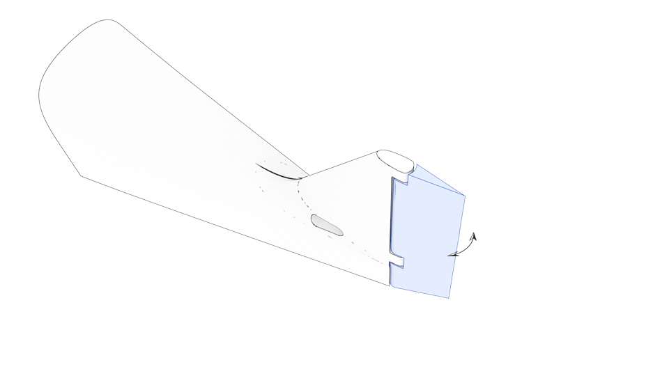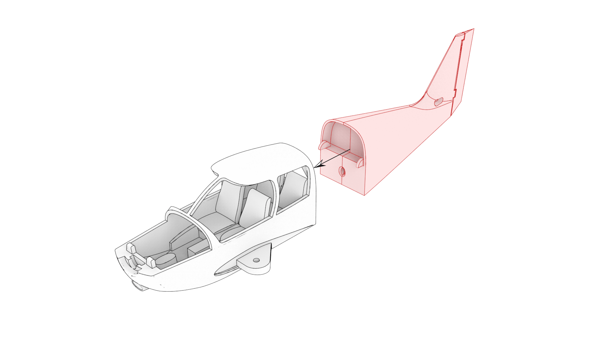 intégre la dérive de l'avion, imprimée en bloc dans la pièce. Cette partie peut être rendue mobile : faites pivoter progressivement de gauche à droite la dérive pour libérer les charnières. Vous pouvez au besoin vous aider d'une fine lame. Attention à ne pas forcer la pièce dans la mauvaise direction, au risque de casser la dérive.