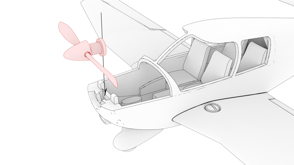 Placer l'hélice dans le logement prévu à l'avant de l'avion. Penser à bien ébavurer les pièces pour que l'hélice puisse tourner librement.